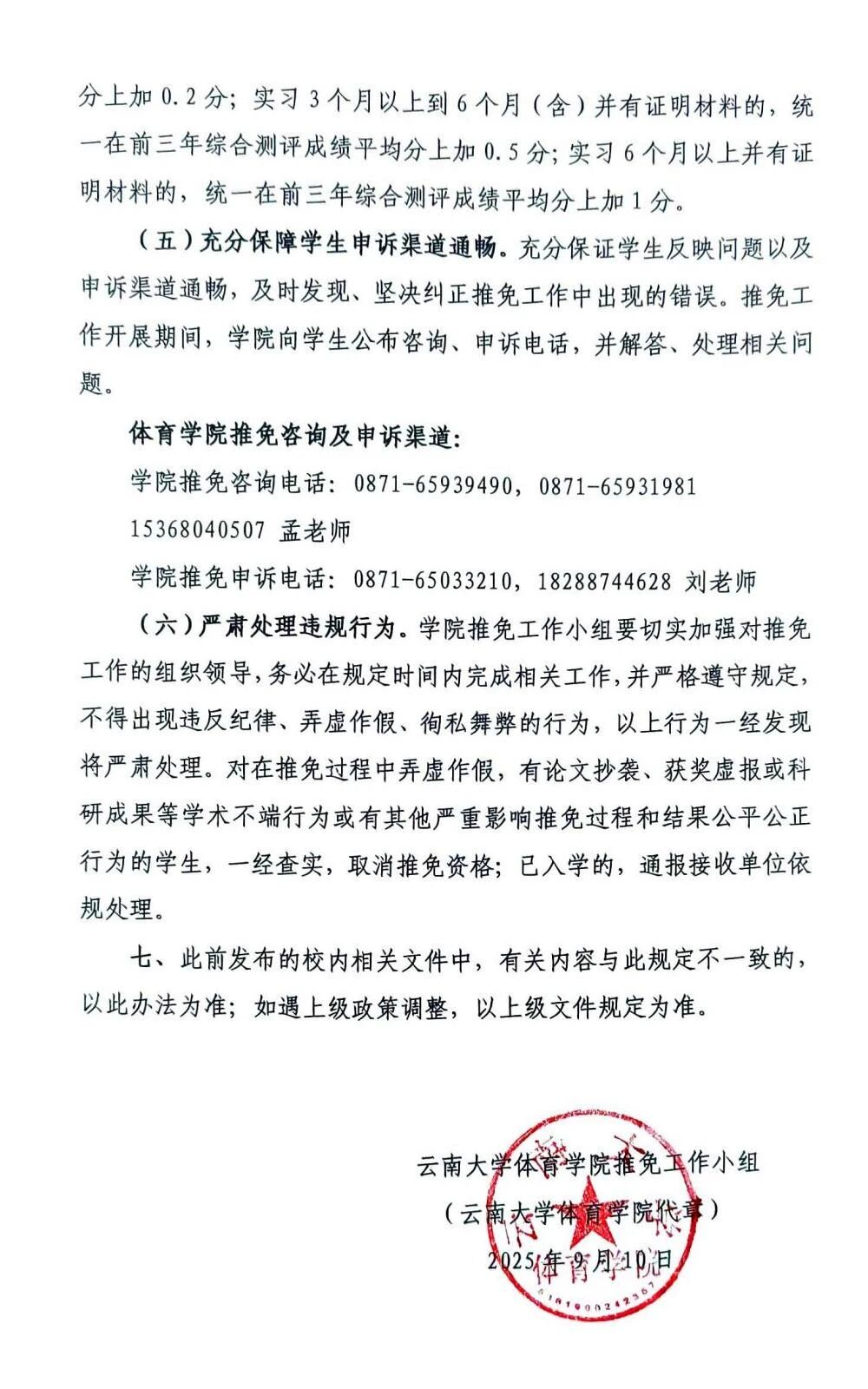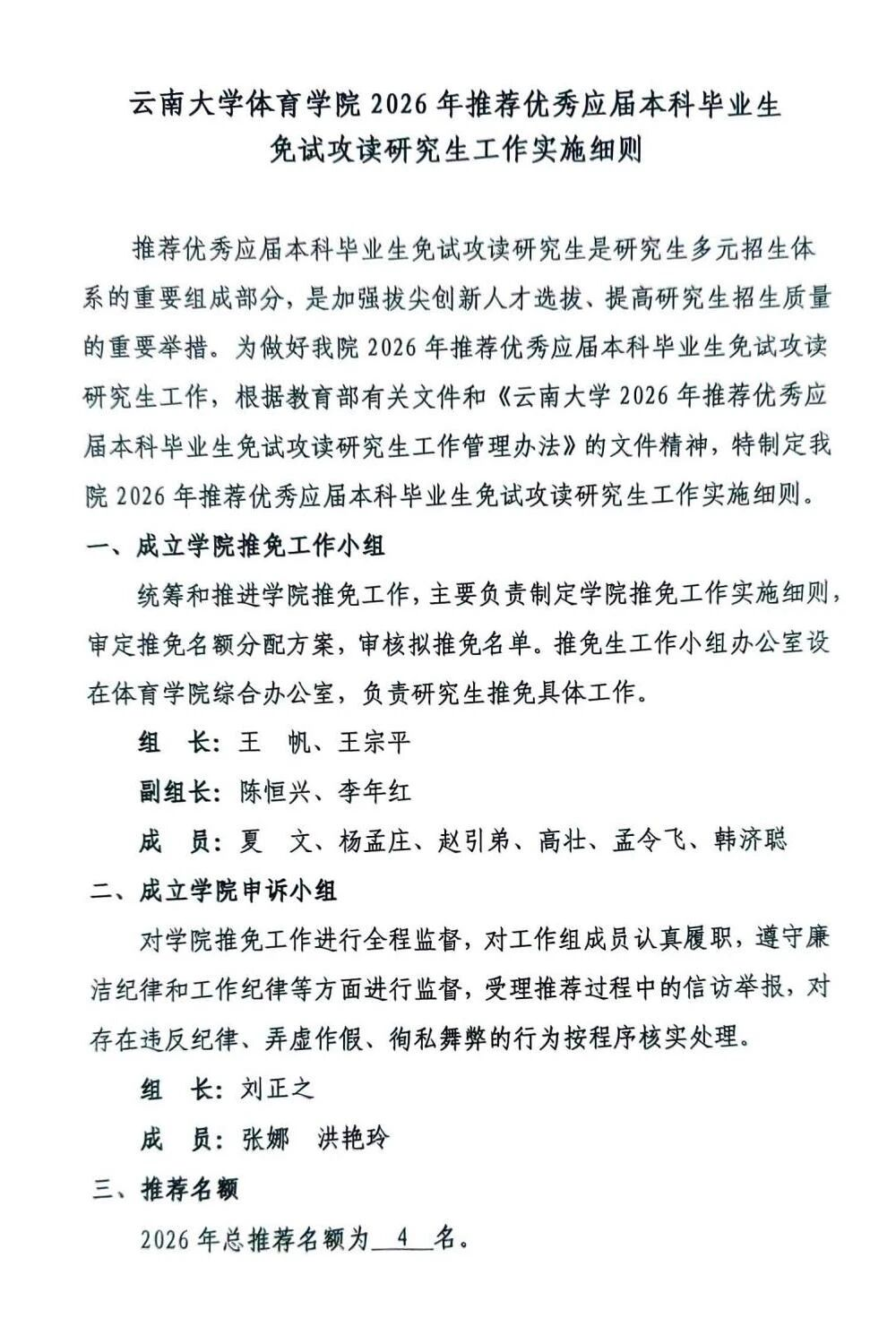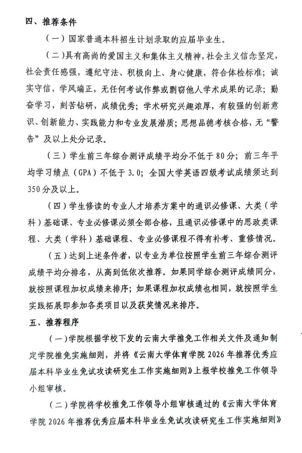 云南大学体育学院2026年推荐优秀应届本科毕业生免试攻读研究生工作实施细则