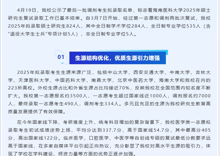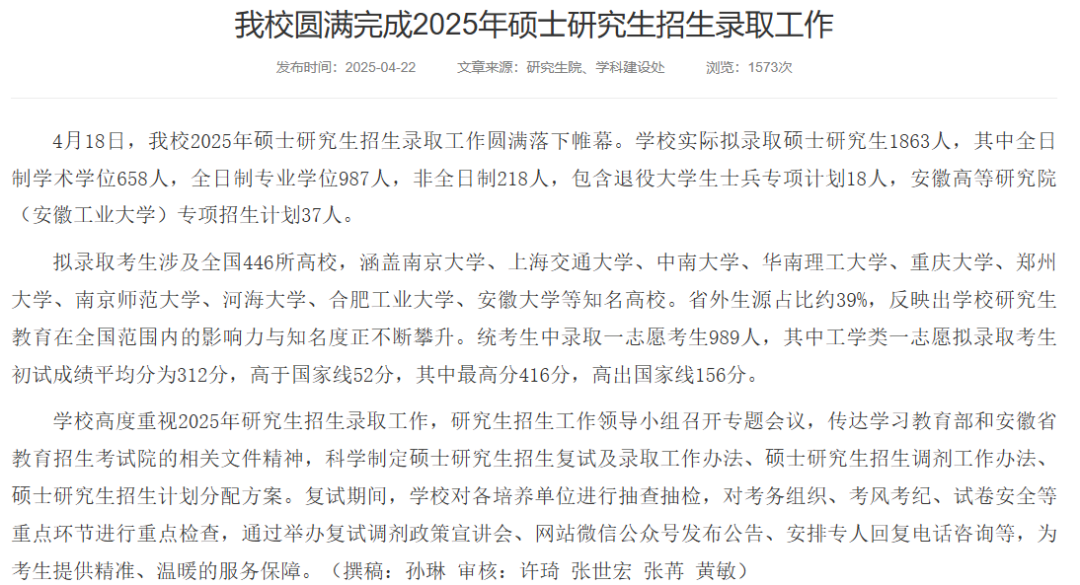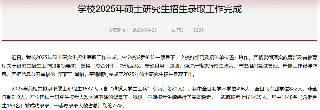 2025年我校共拟录取硕士研究生1537人(含“退役大学生士兵”专项计划20人),其中全日制学术学位496人,全日制专业学位822人,非全日制219人。一志愿报……,其中1148名(含推免生158名)被成功录取,一志愿录取人数占总计划的75%。