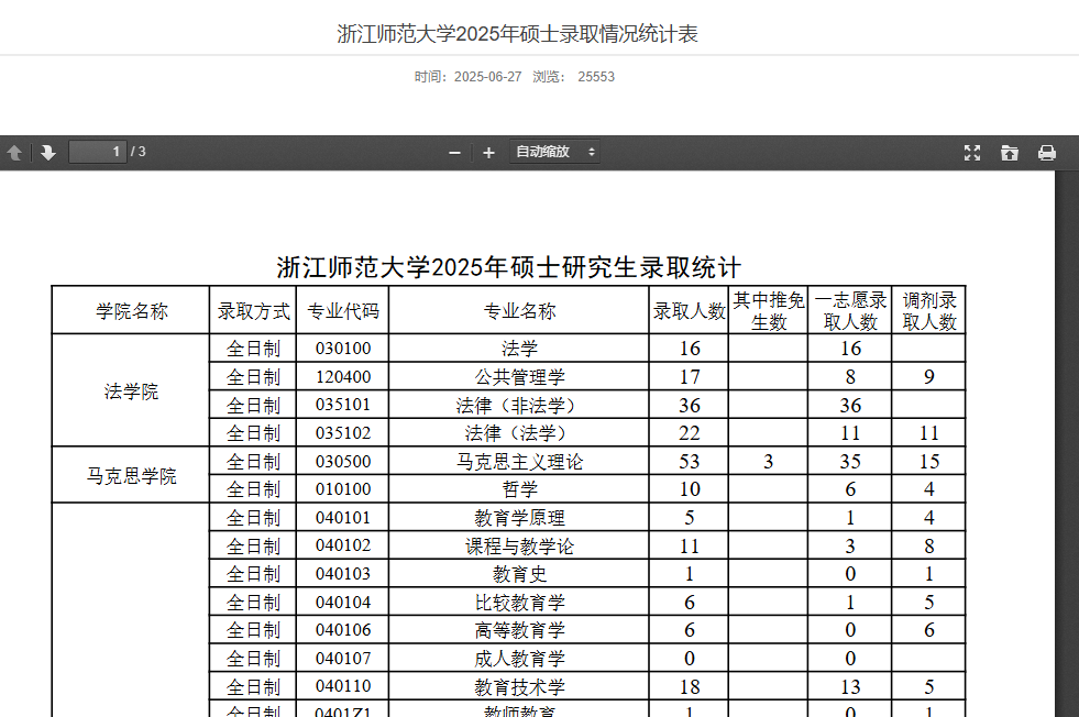 浙江师范大学2025考研共计录取硕士研究生3610人,其中推免生172人(均为全日制教学)、统考生3438人(其中全日制3095人、非全日制343人)。整体推免率为4.8%、一志愿录取率高、一志愿录取*为(即不招收调剂考生)的专业有61个。