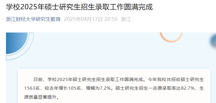 浙江财经大学2025年共招收硕士研究生1563名,较去年增长105名,增幅为7.2%。硕士研究生招生一志愿录取率高,生源质量显著提升。