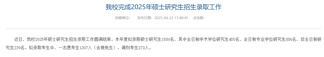 本年度拟录取硕士研究生1580名,其中全日制学术学位研究生455名,全日制专业学位研究生886名,非全日制研究生239名。