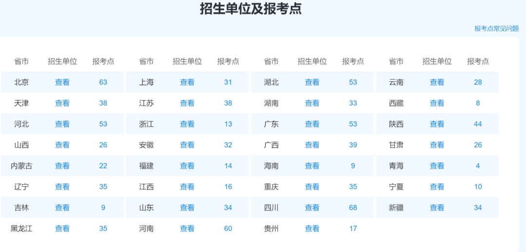 进入 “统考网报” 页面后,下拉界面,找到 “招生单位及报考点” ,在这里你可以看到各个省份的考点信息。