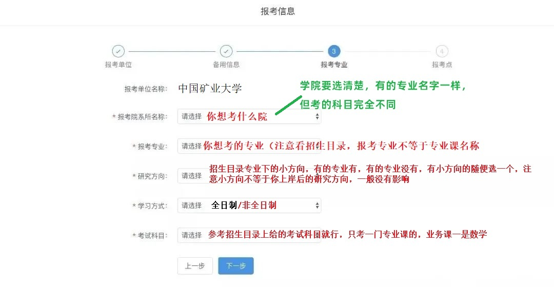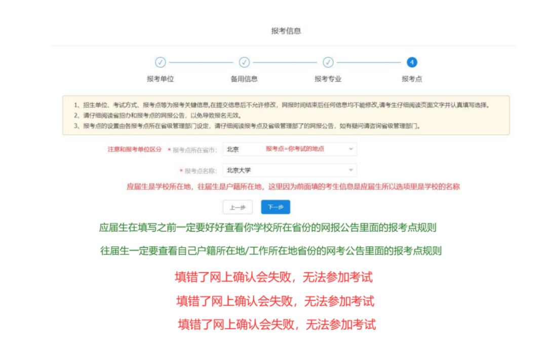 报考信息有四大步骤:报考单位-备用信息-报考专业-报考点。 需要注意的是【招生单位】、【报考点;】、【考试方式】是报考点关键信息,提交后需要修改必须重新填写。