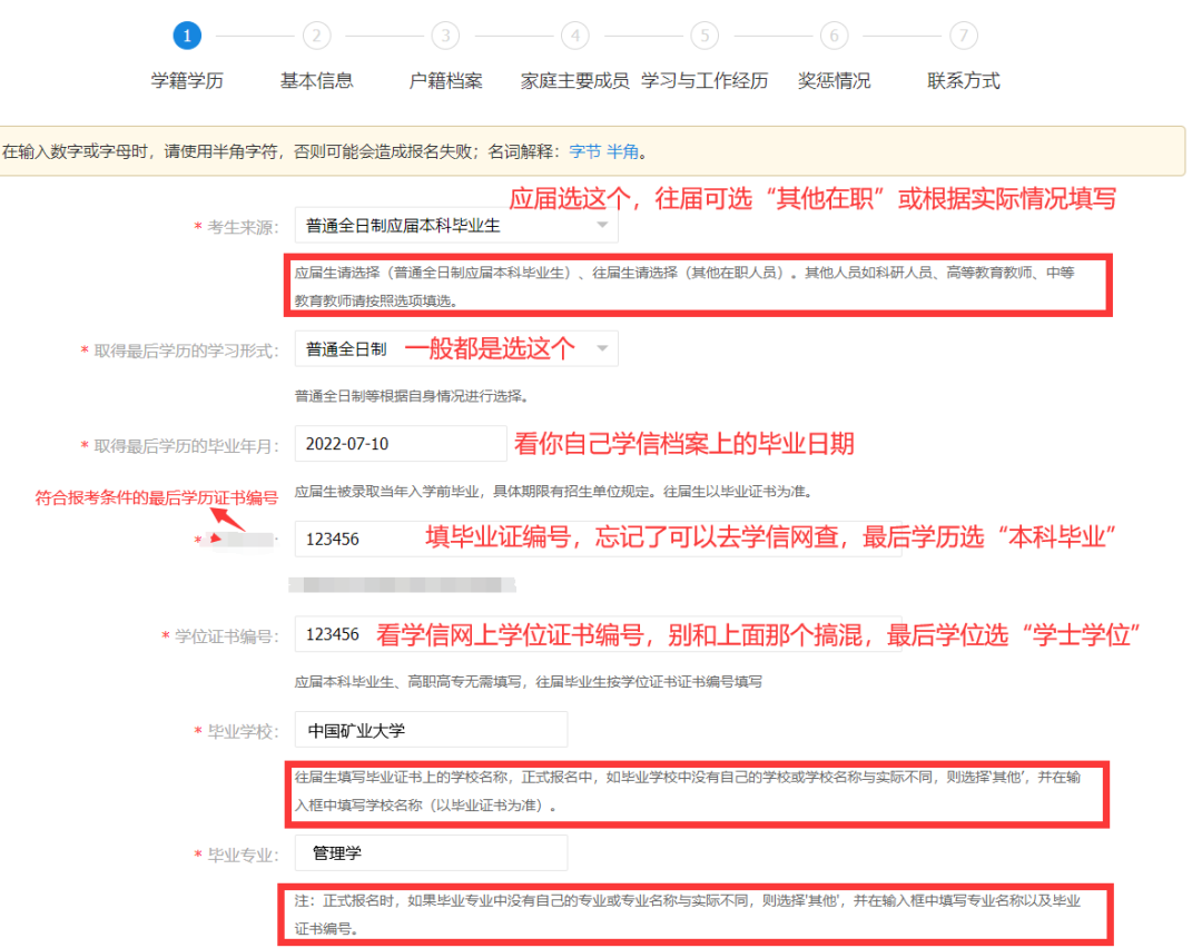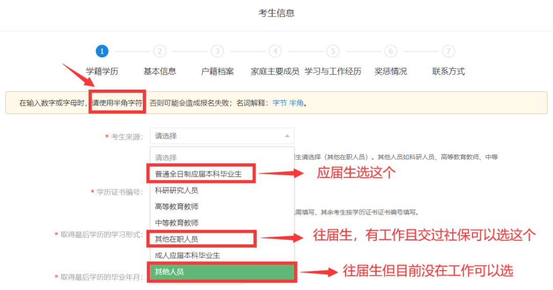 1、学籍学历 根据实际信息填写即可,考生来源需要根据个人情况来选择,二战和往届生选择“其他人员”,在职考生选择“其他在职人员”。