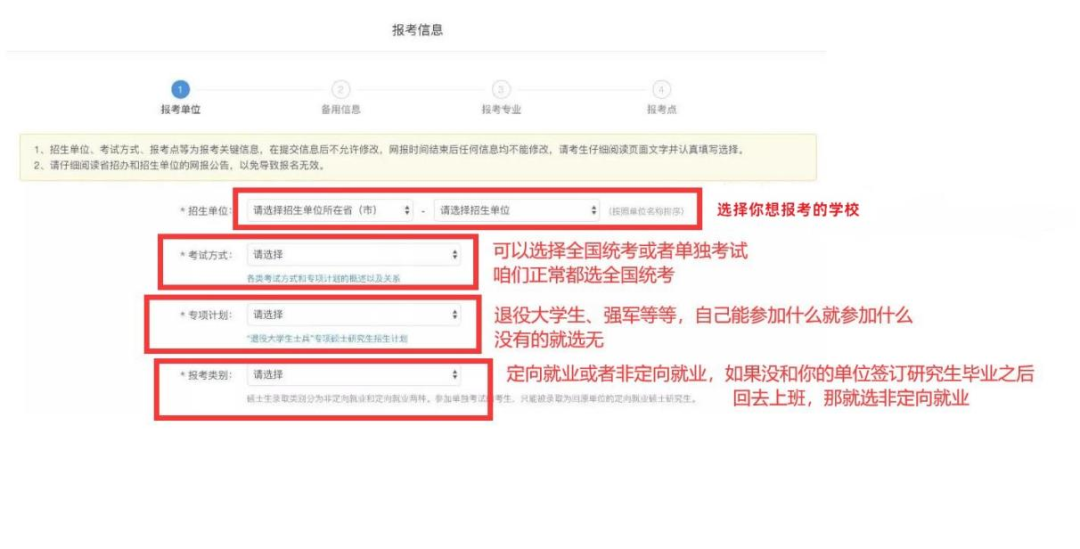 1、报考单位 招生单位:选择目标院校 考试方式:选择【21-全国统考】 没有参加专项计划就选择“无” 对于报考类别,定向就业无法自己选择,酌情选择即可。