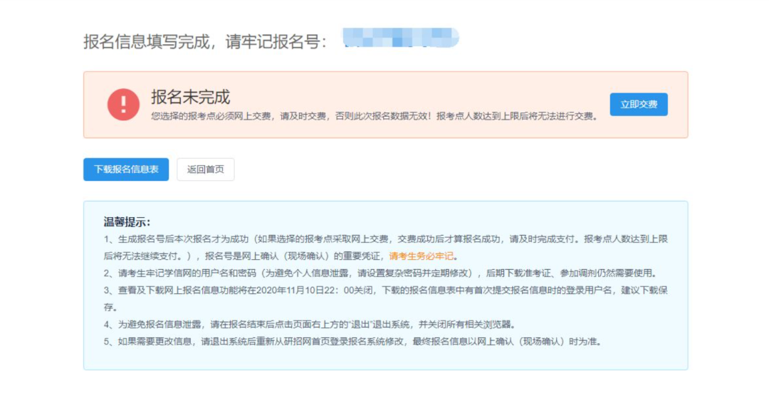 最后根据提示完成缴费。需要注意的是完成缴费才算报名成功。报名成功后要下载报名信息表,之后会用到。