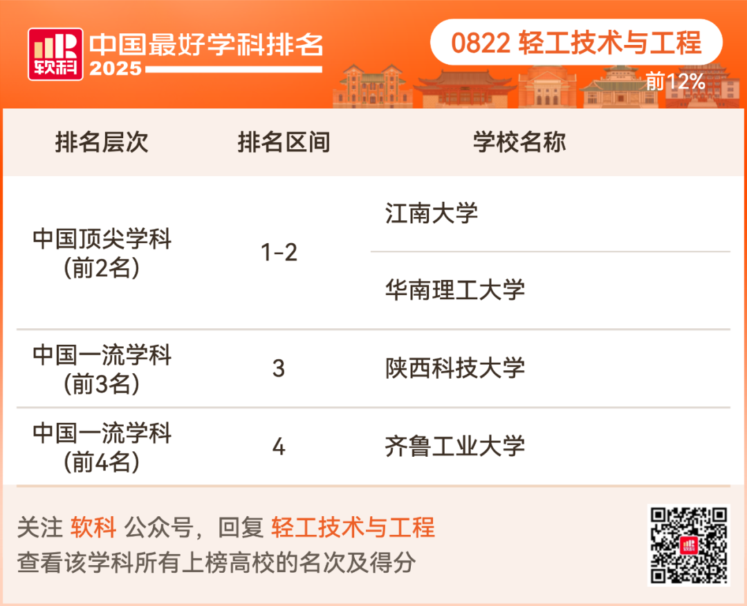 轻工技术与工程排名前12%的高校: