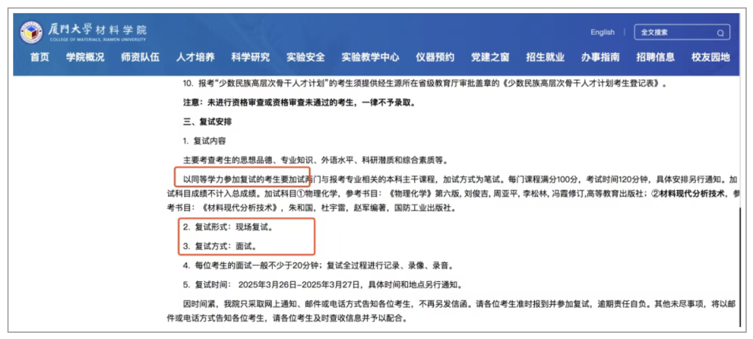 厦门大学还未全面推行取消笔试,但已有院系率先尝试:材料学院 25 考研就采用 “现场面试” 作为复试主要形式,仅要求同等学力考生加试笔试。
