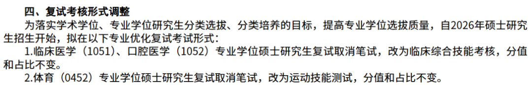 临床医学(1051)、口腔医学(1052)专业学位硕士研究生复试取消笔试,改为临床综合技能考核,分值和占比不变。