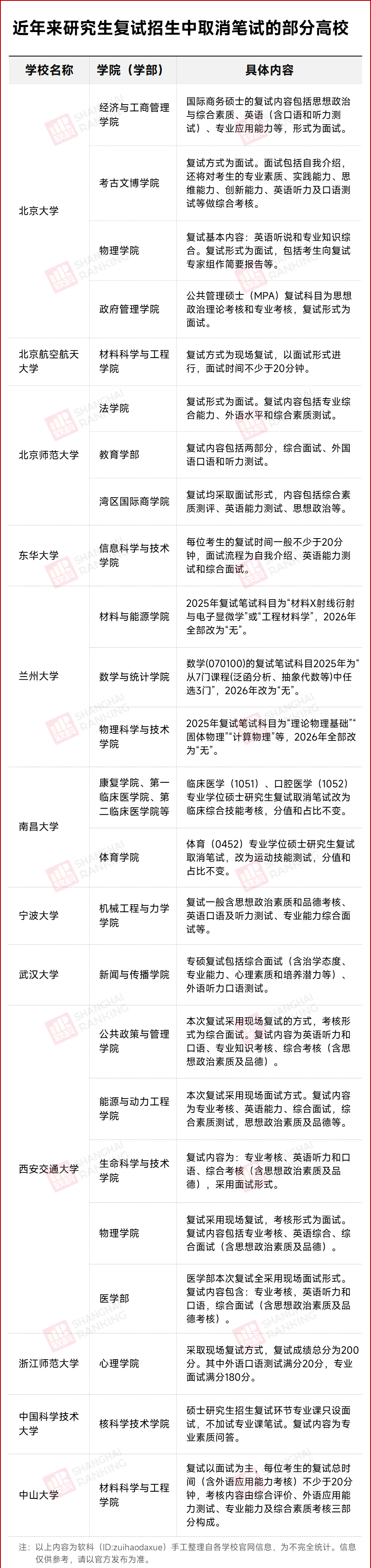 除了此前已调整的4个学院(机械工程与自动化学院、资源与土木工程学院、外国语学院、马克思主义学院)外,理学院、材料科学与工程学院等12个学院/教学部的全部专业均宣布取消笔试。